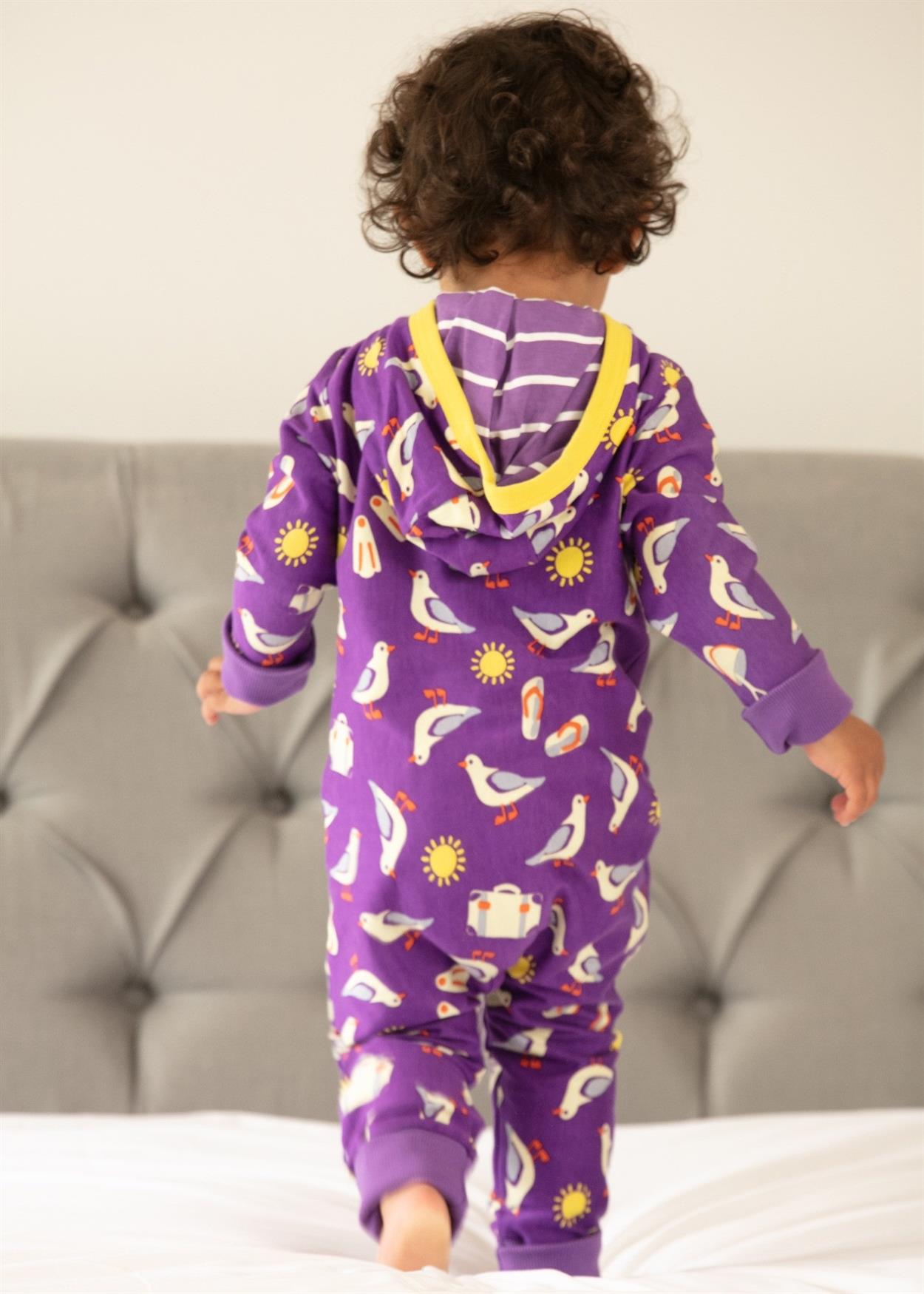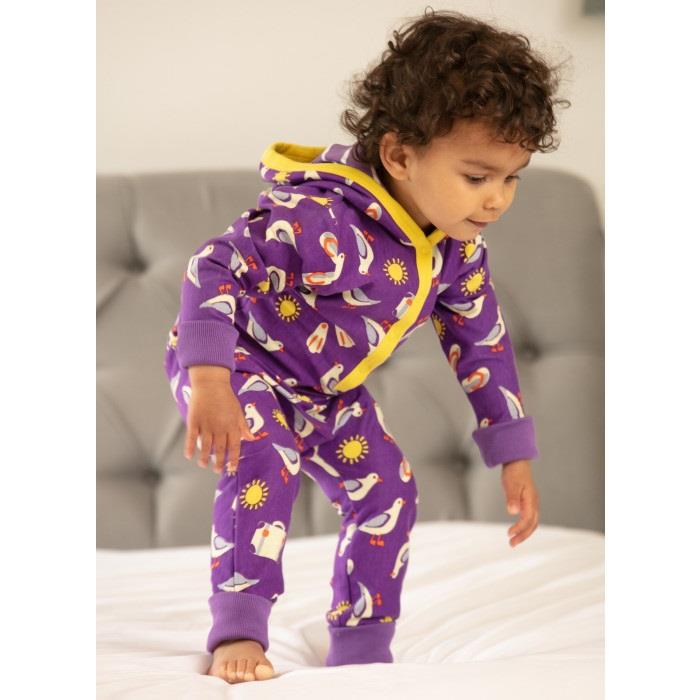 Piccalilly Seagulls Hooded Playsuit: The Perfect All-in-One Outfit for Your Little One The Piccalilly Seagulls Hooded Playsuit is the perfect all-in-one outfit for your little one. It is made with soft and breathable organic cotton, and it features a fun and colourful seagull design on a purple background. The hooded playsuit has poppers on the crutch for sizes up to and including 6-12 months, making it easy to change your baby's nappy. It also has integrated mitts and socks, so your baby can stay warm and cosy. The Piccalilly Seagulls Hooded Playsuit is designed to be gender-neutral, so it is perfect for both boys and girls. It is also designed in the UK and manufactured to the highest ethical standards.