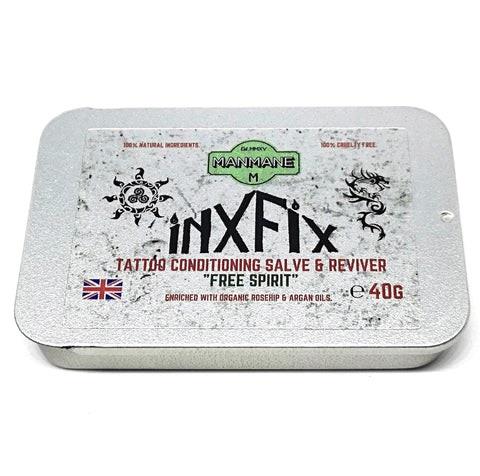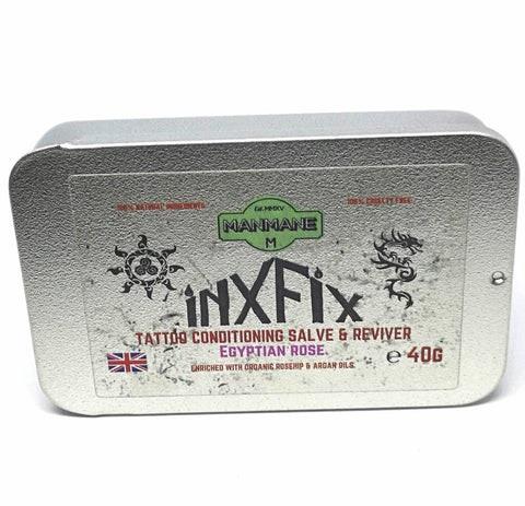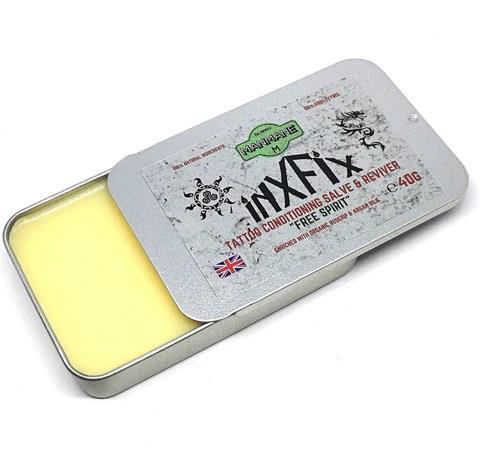 Our salves contain Jojoba wax which is natures closest match to your skins natural oil called sebum. This creates a healthy balance within and underneath your top skin layer the Epidermus. Carnauba wax was added to add vibrancy to the and sheen to your body art. The wax has been used in polishes for the car and wood industry for many years and along with this wonderful benefit it is harmless , 100% Natural and plant based so again working with nature not against it. Organic Shea butter is a fantastic moisturizing properties and is known to treat itching and reduce the need to as well as treating small skin wounds and damaged skin....sound familiar?. The "INXFIX" salves also contain Coconut oil. Coconut oil is naturally antifungal and antibacterial so ideal for the use intended. it also adds to the satisfying aroma of the "INXFIX" salves. The salves are also enriched by the precious oils Argan and Rosehip both of which ...you guessed it ...are certified organic and of the highest quality ( we don't skimp on much cheaper non organic versions). Argan oil is known as a "Dry" oil and is easily and quickly absorbed to lightly moisturise the tattooed area particularly any dry patches which often result after tattoo work. It will also help to settle any acne issues that may be present with daily use. Organic Rosehip oil is wonderful for dehydrated skin and has legendary anti-aging properties thats why it was a no brainer to enrich our salves across the range with it. It also helps to balance out any colour imbalances in the skin areas untouched by ink. The tone of your skin will also benefit from this oil and it is a powerhouse in antioxidants that fight free radicals which can cause skin ailments both at the skin surface and underneath. All in all we would like to assure you the "INXFIX" salves are well thought out and will be of great benefit and we offer it as a contender for the best out there ( trust me we have sampled many market leaders). Our "INXFIX" salves also offer great value for money with a competitive price and because they are so intensive a little goes a long way . We recommend your start off using a small amount and step up or down accordingly. Don't worry you don't need a chemistry degree to work this out your skin will tell you with it absorption time. One 40 g tin will be your friend for 4-12 months depending on your skin type. Each salve is presented in a convenient slide tin which is easily opened . It is also perfectly sized for coat pockets or handbags. The "INXFIX" salves come in two beautiful unisex scents. The essential oils were picked not only for their smell but for their properties. Both blends are designed to be antibacterial and anti-fungal but will work in tandem with the base oils as they share skin care properties. Please note: As with all skin products please patch test initially. DO NOT apply to unhealed freshly tattooed skin. DO NOT use around the eyes or mucous membranes. In conjunction with our entire grooming and cosmetics range the salves are Cosmetic safety tested by a qualified UK chemist and registered on the EU cosmetic notification portal. Both of these are required to comply with UK and EU legislation and necessary before a cosmetic allowed to be offered for sale to the general public. Manmane Ltd takes this very seriously and you can buy with confidence.