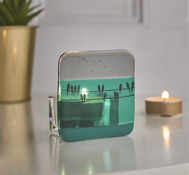 Seeing swallows gathered on a telephone wire is a favourite summer sight for many. Our green tea lights are made with emerald green and teal. After being fired for 24hrs, we screen print by hand our bird illustrations with enamel. The glass is then returned to the kiln for a further 24hrs to be slumped ( take shape) over a mould. These create amazing reflections on a sunny window sill or radiate a warm glow with a candle. Our handmade glass homeware pieces make lovely gifts and are all handmade in our Twice Fired glass studio in Leeds, West Yorkshire