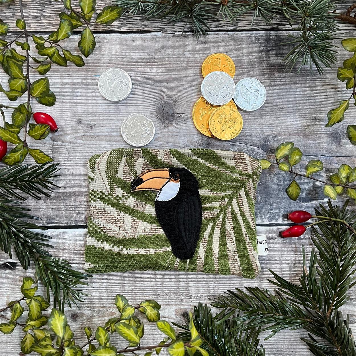 These coin purses are made from soft upholstery fabric due for landfill. They are made from the off cuts left over from bespoke sofas. Once the component parts are cut for the sofa the bits that are not big enough to make anything else from are thrown away. As this fabric is upholstery grade it means it’s very durable and hard wearing so no need to be lined. Each one is embellished with a fabric Toucan, again all from fabric that was going to be thrown away. As I only get small quantities of each fabric it means each one is unique. Just use the drop down menu to pick your favourite. See pictures for the corresponding numbers. They have plenty of space for your change, notes and a few bank or store cards. You could probably squeeze your front door key in or maybe a lip balm on a night out too. They have a zip on the top in a complementary colour so nothing escapes and a ribbon label to one side with the website details on. Size is approximately 14cm wide and 10cm high. The zip hole is approximately 10cm.