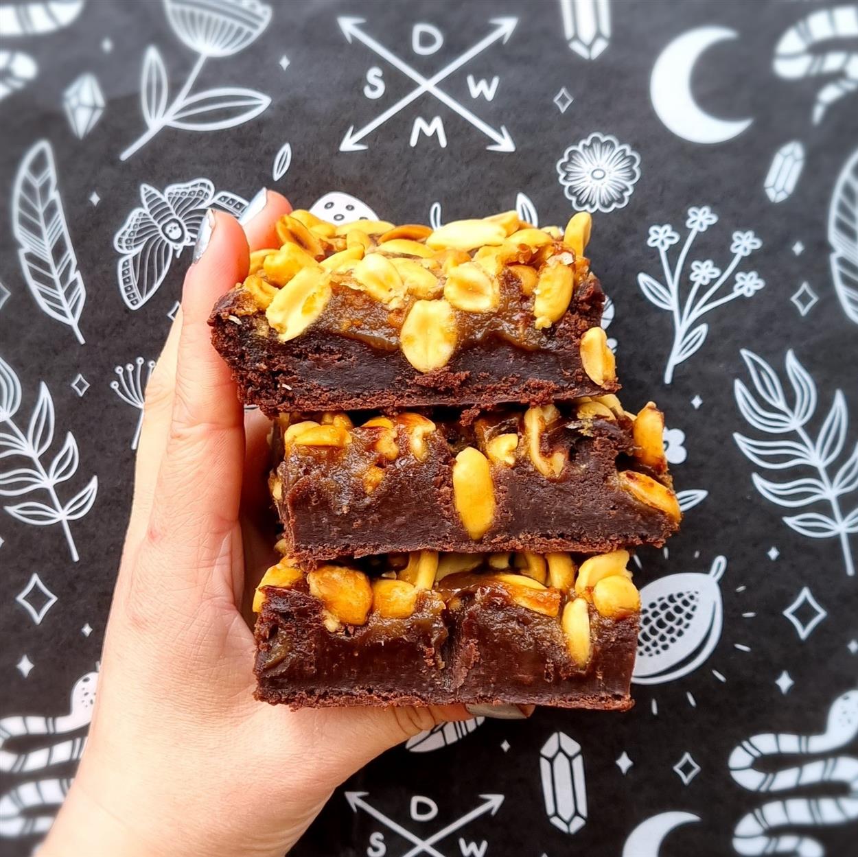 INGREDIENTS: 70% Dark Chocolate (Cocoa Mass, Sugar, Cocoa Butter, Emulsifier: SOYA Lecithin, Natural Vanilla) [SOYA], Cane Sugar, Organic Soya Drink (Water, Organic Soya Beans (11.5%), Organic Rice Syrup, Sea Salt )[SOYA], Organic White WHEAT Flour (Wheat Flour fortified with Calcium Carbonate, Iron, Niacin & Thiamin) [WHEAT, GLUTEN],Peanut Swirl (100% Peanut Butter [PEANUTS], Cane Sugar, Organic Soya Drink (Water, Organic Soya Beans (11.5%), Organic Rice Syrup, Sea Salt)) [PEANUTS, SOYA], Egg Replacer (Potato Starch, Tapioca Starch, Raising Agent: Calcium Carbonate, Acidity Regulator: Citric Acid, Vegetable Gum (Stabiliser): Methylcellulose), Rapeseed Oil, Cocoa Powder, Baking Powder (Wheat Flour, Sodium Acid Pyrophosphate E450(i),Sodium Bicarbonate E500(ii) ) [WHEAT, GLUTEN], Peanuts (Peanuts, Salt, Rapeseed Oil)[PEANUTS] Allergens: Soya, Wheat, Gluten, Sulphites Baked in a kitchen that handles Peanuts, Nuts