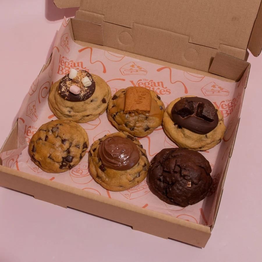 Chunky New York style cookies.. perfect to enjoy for a movie night on the sofa or the perfect gift to send to someone special The OG - our delicious chonky new york style cookies generously studded with choc chunks Brownie Stuffed - choc chunk cookie stuffed with our fudgy brownie, baked & topped with chocolate & more brownie chunks Biscoff lovers - choc chunk cookie piped & topped with biscoff spread & a biscoff biscuit Triple Choc - choc mud new york cookie dough filled with dark & white choc chunks! Notella - piped & topped with a vegan hazelnut chocolate spread.. delish (included in the box of 6) S'mores - choc chunk new york cookie filled with a marshmallow, baked & topped with chocolate, marshmallow & a biscuit crumb (included in the box of 6) Our treats aren’t just ordinary bakes, they are the baddest vegan bakes out there. Enjoyed by both vegans and non vegans, our brownies & blondies are super fudgy & cookies gooey..The indulgent & deliciousness you want in every treat. Our bakes are beautifully wrapped in our signature greaseproof paper, packaged in a box & sealed with a sticker, to ensure you have the best experience when receiving your The Vegan Bakes box. All treats are handmade in small batches from scratch in our 5 star rated kitchen. SHELF LIFE: 10 DAYS at room temperature - keep sealed & in a cool place. Can be frozen for up to 3 months. GENERAL INGREDIENTS: Flour (WHEAT flour, Calcium Carbonate (E170), Iron, Nicotinamide (Vit B3), Thiamine Hydrochloride (Vit B1)), Sugar, Dark Chocolate (Cocoa Mass, Sugar, Cocoa Butter, SOYA Lecithin E322), SOYA drink (Water, Hulled (7%):Soya Bean:, Tri-calcium Phosphate, Maltodextrin, Flavouring substance, Stabiliser:Gellan Gum:, Vitamin B2, Vitamin D2, Vitamin B12), Vegan spread (Vegetable Oils (Rapeseed Oil, Palm Oil), Water, Salt, Emulsifier (Mono & Diglycerides of Fatty Acids), Preservative (Potassium Sorbate), Colour (Annatto Bixin, Curcumin), Acidity Regulator (Citric Acid), Flavouring), Vegetable Oil, Rapeseed Oil, Baking Powder (WHEAT Flour, Calcium Carbonate, Iron, Niacin, Thiamin), Raising Agents: Sodium Acid Pyrophosphate E450i, Sodium Bicarbonate E500 (ii), Cocoa Powder (96,16%), acidity corrector (potassium carbonate) (3,84%), Cornflour, Vanilla Extract (Water, Flavouring, Colour: Caramel (E150), Sodium Bicarbonate, Salt CHOC: general ingredients BISCOFF: General ingredients plus Lotus Biscuits (WHEAT Flour, Sugar, Vegetable Oils (Palm Oil from sustainable and certified plantations, Rapeseed Oil), Candy Sugar Syrup, Raising Agent (Sodium Hydrogen Carbonate), Soya Flour, Salt, Cinnamon), Lotus Biscoff Spread (Original Caramelised Biscuits 58% (WHEAT Flour, Sugar, Vegetable Oils (certified sustainable Palm Oil, Rapeseed Oil), Candy Sugar Syrup, Raising Agent (Sodium Hydrogen Carbonate), SOYA Flour, Salt, Cinnamon) NOTELLA: General ingredients plus Hazelnut Spread (Sugar, Palm Oil, HAZELNUTS (11%), Fat Reduced Cocoa Powder (9%), Emulsifier (Sunflower Lecithins), Natural Vanilla Flavouring) TRIPLE CHOC: General ingredients plus Vegan White Chocolate (Sugar, cocoa butter [32%], rice flour, coconut oil, flavouring (vanilla), emulsifier (sunflower lecithin). Emulsifier (SOYA Lecithin), Acid (Citric Acid) & Cocoa Powder (96,16%), acidity corrector (potassium carbonate) (3,84%) BROWNIE: General ingredients plus Cocoa Powder (96,16%), acidity corrector (potassium carbonate) (3,84%) S'MORES: General ingredients plus Rich Tea Biscuits Fortified WHEAT Flour (WHEAT Flour, Calcium Carbonate, Iron, Niacin, Thiamin), Sugar, Palm Oil, Partially Inverted Sugar Syrup, Barley Malt Extract, Salt, Raising Agents: Sodium Hydrogen Carbonate, Ammonium Hydrogen Carbonate:, Emulsifier:Mono- and Diacetyl Tartaric Acid Esters of Mono- and Diglycerides of Fatty Acids) & Marshmallows (Glucose-fructose syrup, sugar, water, modified tapioca starch, corn starch, gelling agent: carageenan; hydrolysed rice protein, flavourings & colours), Corn Starch, Water, Citric acid, Acidity Regulator (E331), Flavoruing, vegetable Oil (Palm), Colours (E129, E133, E102) CONTAINS NUTS, WHEAT & SOYA Our kitchen handles WHEAT, SOYA & NUTS. Whilst we don’t use milk or egg in our kitchen, products may contain MILK or EGG due to manufacturing methods of some of the ingredients we use. Our bakes are not suitable for MILK, EGG & NUT allergy sufferers.