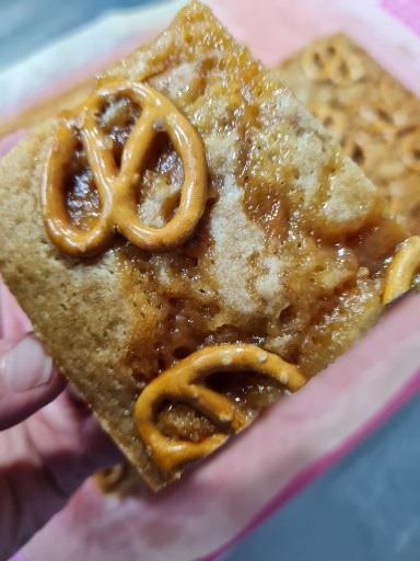 Allergens: Soya, Wheat (Gluten) Ingredients: Baking Powder, Caramel, Flaxseed, Flour, Salt, Salted pretzels, Soya Milk, Sugar, Vegetable oil