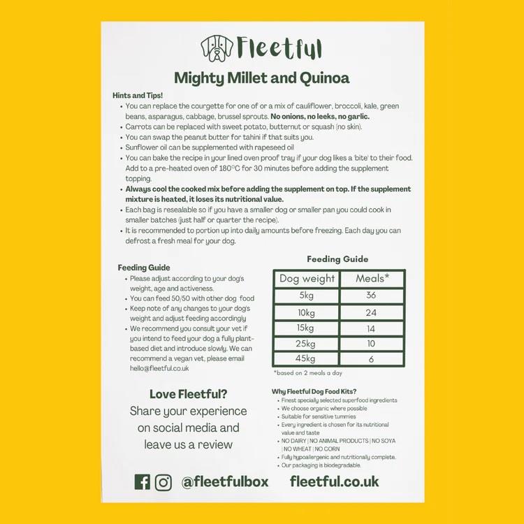 OPTIMUM NUTRITION ABSORPTION Feeding fresh is best, but making balanced dog food is hard to get right. Fleetful kits are vet formulated for maximum nutrient absorption. Dogs have short digestive systems and need to start processing nutrients as soon as they are swallowed. Fleetful plant protein allows just this. Each ingredient is chosen to ensure long-term health benefits to your dog when fed as a regular diet. PREMIUM INGREDIENTS Fleetful plant protein is chemical-free. We believe in organic, human-grade ingredients to give your dog the best chance to lead a long and happy life. Our dogs' bodies can focus on absorbing nutrients not removing toxins. HELPING OUR PLANET One degradable bag of Fleetful plant protein is equivalent to 20 tins of dog food. For a 20kg dog, that is 1400 tins saved from landfill a year! That's almost 21kg of metal! Our protein sources are not animal-based. Your dog's carbon paw-print will be up to 20 times less than meat-based pet foods. How to use - Mighty Millet and Quinoa Each Fleetful Mighty Millet and Quinoa Dog Food Kit contains: 1400g of Fleetful Plant Protein Flakes 150g JUST BE KIND Supplement (vitamins, pre and pro-biotics to make food nutritionally complete and healthy) 6 x Vegetology Omega 3/Vit D3 Algae Oil Capsules Recipe card and information Simply add a few ingredients to Fleetful protein flakes to make delicious dog food. Add Fleetful protein flakes to cooked vegetables. Empty onto a tray and cool. Mix JUST BE KIND Supplement with sunflower oil, pure peanut butter and omega 3 capsules. Spread supplement mix onto cooled food. Portion to dog's weight and freeze Feeding Guide once cooked On 2 meals a day, Fleetful Mighty Millet and Quiona Dog Food Kit will feed: 36 meals for a 5kg dog 24 meals for a 10kg dog 14 meals for a 15kg dog 10 meals for a 25kg dog 6 meals for a 45kg dog Your dog will thrive on 100% Fleetful. Some owners like to feed half with other food to give variety and a nutritional 'kick'. We pride ourselves on transparent labelling Composition of Fleetful plant protein (before cooking): Organic Quinoa Flakes, Organic Millet Flakes, Organic Pea Protein Analytical Constituents (Fleetful powder) Protein 19.61% 5.9%, Fat 6.12%, Ash 1.73 %, Fibre 1% Analytical Constituents (fully cooked meal when recipe followed) Protein 6.57%*, Fat Content 2.67%, Inorganic Matter 1.33%, Crude Fibre 1.22%, Moisture Content 72.4%. *6.57% protein as formulated, equivalent to 23.5% on a dry matter basis COMPOSITION OF SUPPLEMENT Minerals, Plants and derivatives, Fermentation Products, Bacillus velezensis (as a source of probiotic), Rapeseed oil ANALYSIS OF SUPPLEMENT Crude Protein 20%, Crude Fat 1.1%, Crude fibre 0.1%, Insoluble Ash 6.1%, Calcium 17.8%, Phosphorus 4.5%, Sodium 0.7% NUTRITIONAL ADDITIVES (per kg) Vitamin A 40000IU, Vitamin E 400mg, Vitamin B1 109mg, Riboflavin 100mg, Vitamin B6 20mg, Vitamin B12 1000µg, Niacin 200mg, Calcium pantothenate 100mg, Folic acid 20mg, Biotin 400µg, L-Carnitine 15640mg, Choline chloride 13333mg, Iodine 10mg, Selenium 2mg, Copper 30mg, Zinc 400mg, Manganese 40mg, Iron 200mg, L-Lysine monohydrochloride 7000mg, DL-Methionine 150000mg, L-Threonine 15000mg, Taurine 31250mg, L-Tryptophan 31000mg, L-Valine 10000mg, Gut Flora Stabiliser: Bacillus velezensis (DSM 15544) 2×1011 CFU.