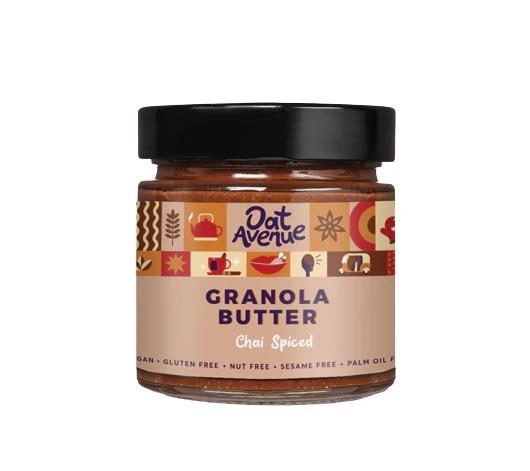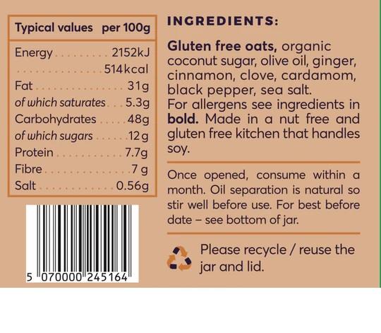 Chai Spiced Granola Butter Ingredients: Gluten Free Oats, Organic Coconut Sugar, Olive Oil, Ginger, Cinnamon, Cardamom, Clove, Black Pepper and Sea Salt For allergens - see ingredients in bold. Storage: Once opened, consume within a month. Packaging: Our packaging is plastic free. Please recycle or reuse jar and lid and recycle the label. Made in London, UK