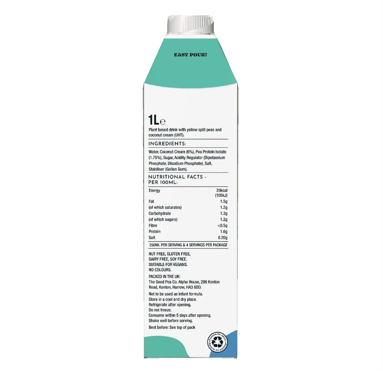 The Good Pea Co. Barista brings your favourite hot beverages to you, you can froth up that dalgona, steam up that hot chocolate and blend into that smoothie. Pour directly into your favourite teas and coffees and you’ll be ready for day! INGREDIENTS INFORMATION: Water, Coconut Cream (6%), Pea Protein Isolate (1.75%), Sugar, Acidity Regulator ( Dipotassium Phosphate, Disodium Phosphate), Salt, Stabiliser (Gellan Gum) NUTRIENT NUTRITIONAL FACTS (PER 100 ML) Energy 25 kcal / 105 kJ Fat 1.5 g of which saturates 1.2 g Carbohydrate 1.3 g of which sugars 1.2 g Fibre <0.5 g Protein 1.6 g Salt 0.20 g