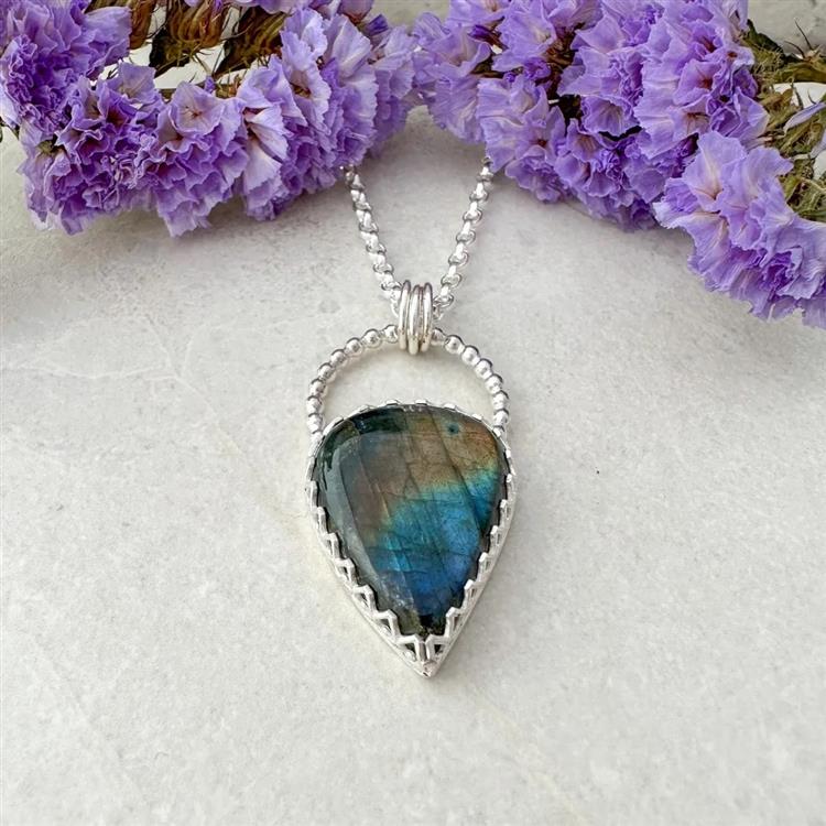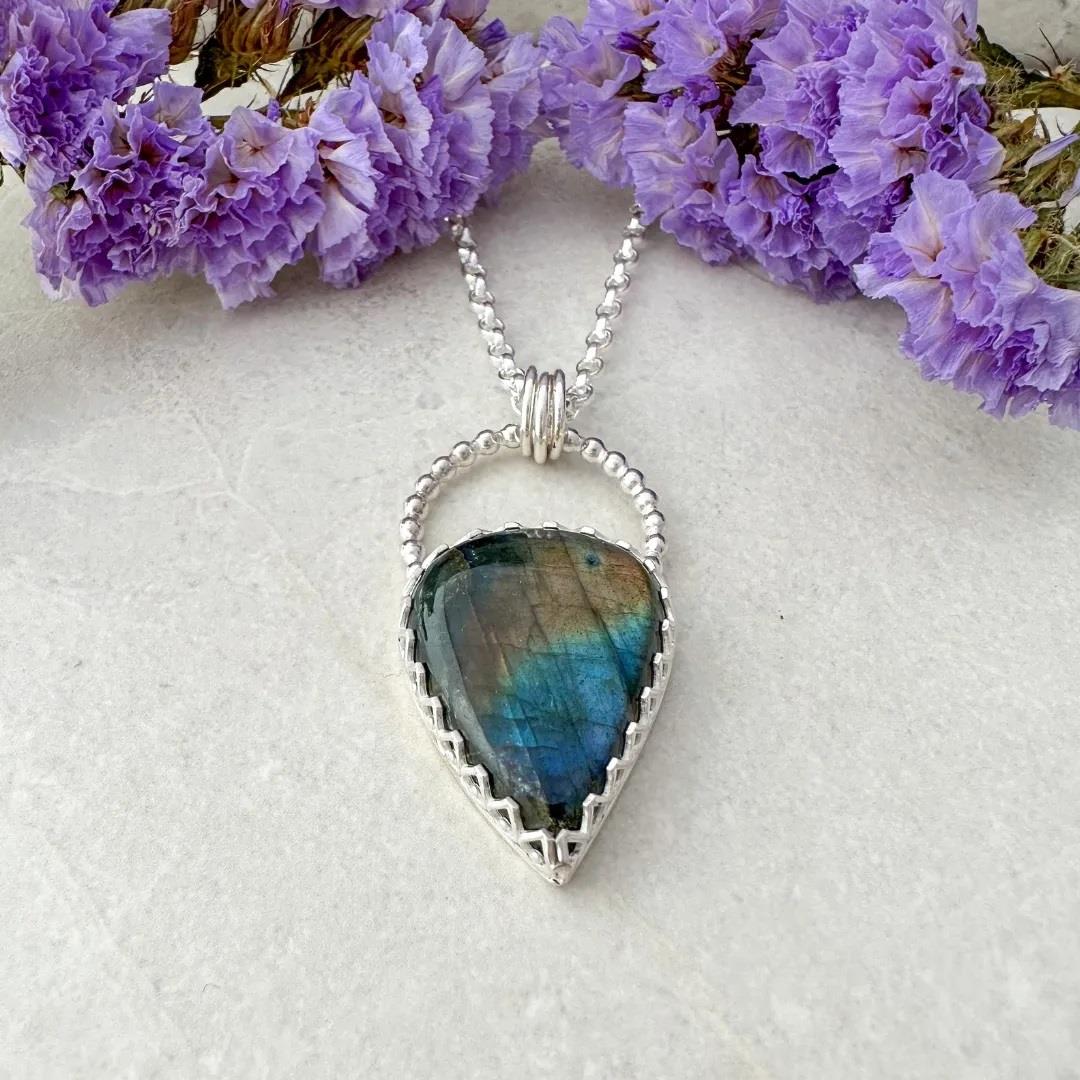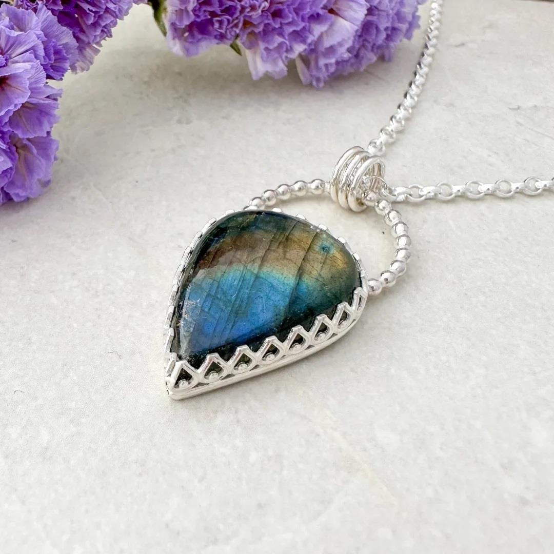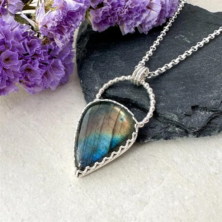 Labradorite is typically a grey colour gem with flashes of colour that show as light interacts with the layers within the gemstone. This gemstone is a teardrop shape. This particular piece has a strong blue tone across the surface towards the bottom of the gem and a stripe of reddish tone across the middle. Set in a handmade sterling silver setting with a wave pattern to show off as much of the beautiful labradorite as possible; with a beaded silver loop over the top from which 3 jump rings hang to attach the 18 inch chain.