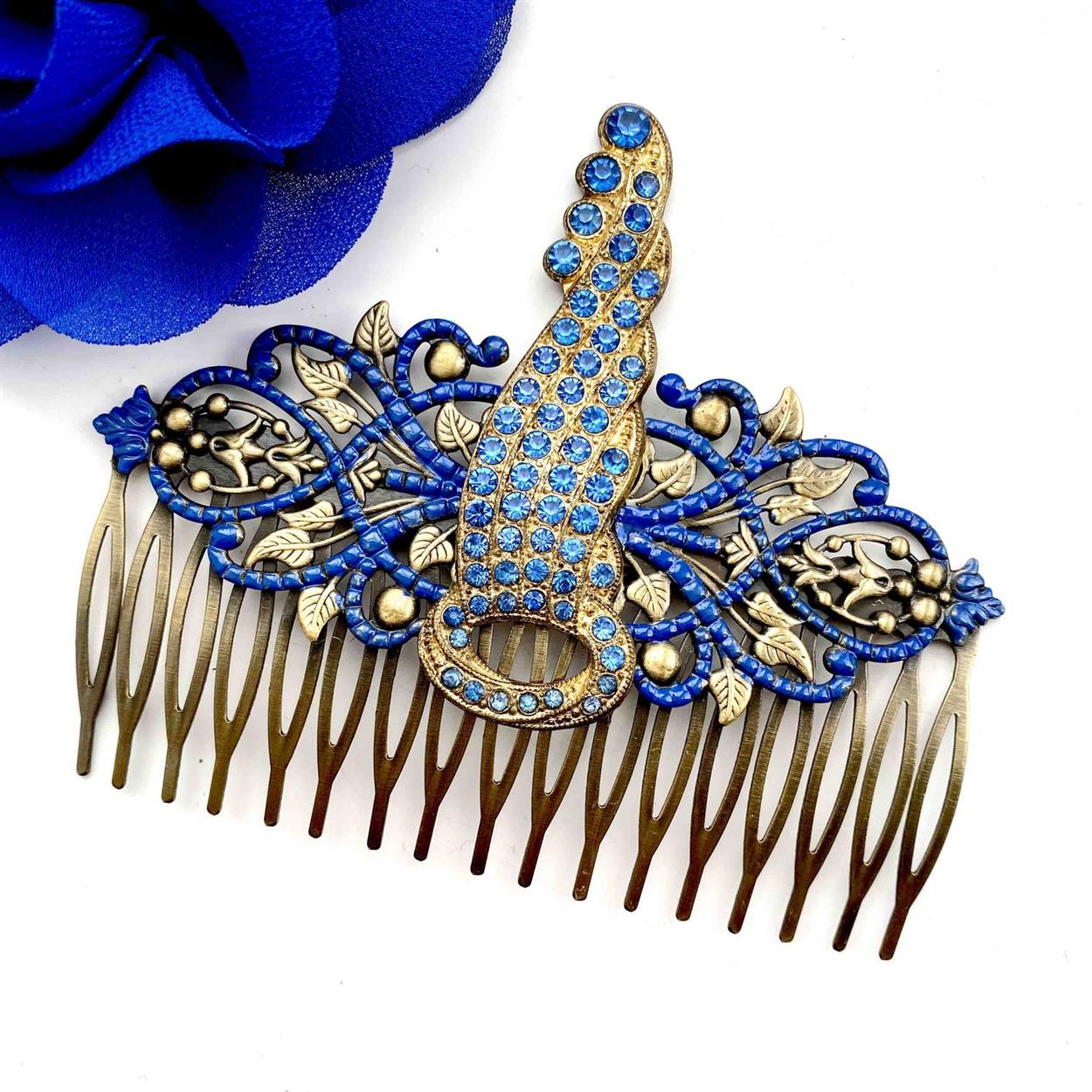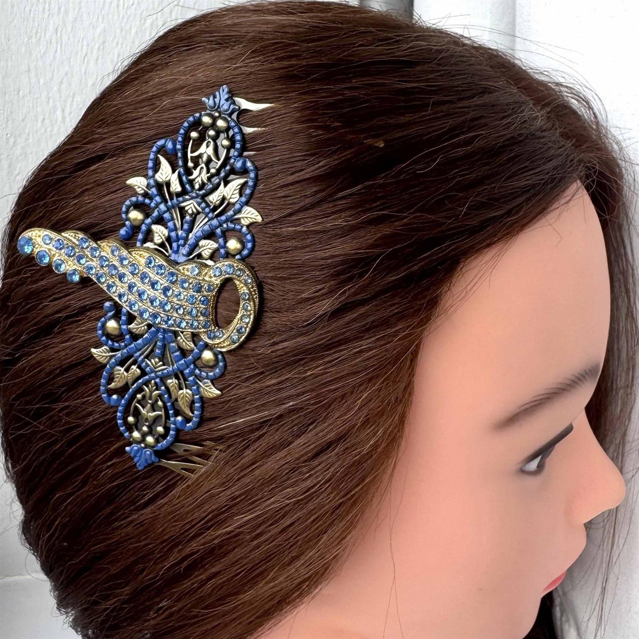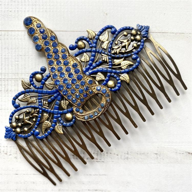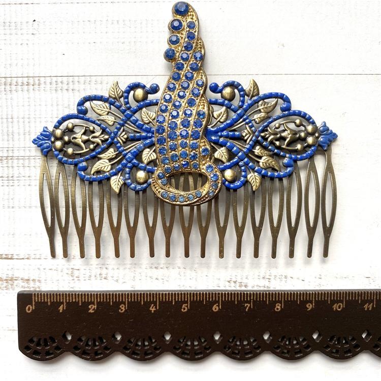 - Mounted on a hand painted antique-gold tone Hair Comb.