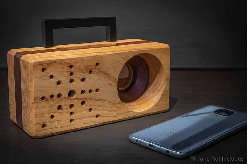 Meticulously designed with an integrated sound chamber, this elegant accessory amplifies audio output compared to just the phone speakers, delivering improved directional, more immersive sound. Made from a selection of sustainably sourced hardwoods, each with its own unique grain and character. Made using mainly Ash & Sapele with Cherry, Maple & Purpleheart accents.
