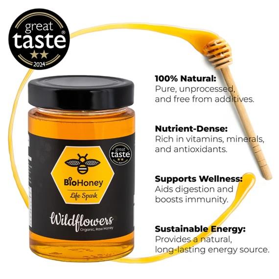 Every drop is filled with fresh, golden organic h oney, bursting with natural flavor and health benefits. Whether you enjoy it as a healthy snack, a natural sweetener, or a wellness supplement, ours delivers exceptional purity, rich flavor, and incredible health benefits. From Hive to Table – 100% Pure & Natural Sustainably harvested from Bulgaria’s pristine mountainous regions, where bees collect nectar from wildflowers in untouched forests. These diverse, unpolluted landscapes allow our bees to produce honey that is free from pesticides, chemicals, and artificial additives. Unlike conventional h oney, which is often pasteurized, heated, or diluted with syrups, ours is 100% natural, unfiltered, and nutrient-rich. This ensures that you receive a product that is as pure and wholesome as nature intended. Carefully harvested and packaged without heat treatment, preserving all essential nutrients, natural vitamins, minerals, and bioactive compounds. Nutrient-Dense Superfood More than just a delicious treat, it is a powerful natural superfood packed with enzymes, amino acids, and bioactive compounds. Used for centuries in traditional medicine, it supports overall health, energy, and immunity. A Natural Wellness Elixir – Raw & Unprocessed Unlike refined sugars and artificial sweeteners, ours is a low-glycemic, natural alternative that helps maintain stable blood sugar levels while providing long-lasting energy. With its anti-inflammatory, antibacterial, and healing properties, it is a trusted natural remedy: Soothing sore throats and coughs Aiding digestion and gut health Providing relief from seasonal allergies Helping with wound healing and skin nourishment Never heated or processed, all its nutrients and beneficial enzymes remain intact, ensuring maximum health benefits in every bite. Key Benefits · Boosts Immunity – Naturally rich in antioxidants, vitamins, and propolis, helping to strengthen the immune system and protect the body from free radicals and infections. · Supports Digestive Health – Contains natural prebiotics that promote gut health, digestion, and metabolism. · Natural Energy Source – Provides a quick energy boost, making it an excellent pre-workout or post-workout snack. · Promotes Oral Health – Helps cleanse the mouth, reduce plaque build-up, and support gum health. · Holistic Wellness – Used in traditional medicine for its anti-inflammatory and antibacterial properties, helping with sore throats, allergies, and skin health. How to Enjoy · Eat it straight for a pure, raw honey experience. · Spread it on toast, pancakes, or waffles as a natural, unprocessed sweetener. · Pair it with gourmet cheeses, fruits, and nuts for an exquisite charcuterie board. · Stir it into yogurt, oatmeal, or smoothies for an added nutrient boost. · Dissolve it in warm tea to enhance flavor and promote wellness. · Drizzle over desserts like ice cream, cakes, and tarts for a rich, natural sweetness. · Incorporate into salad dressings and marinades for a unique depth of flavor.