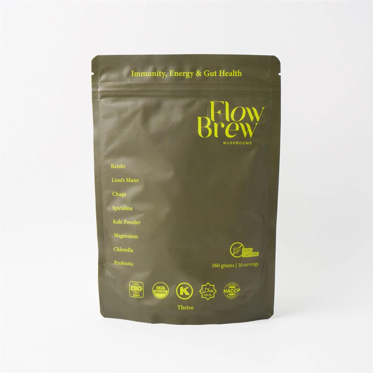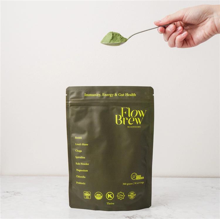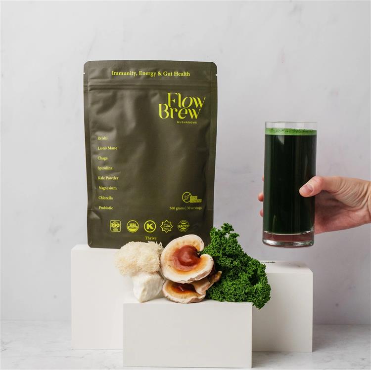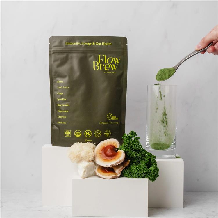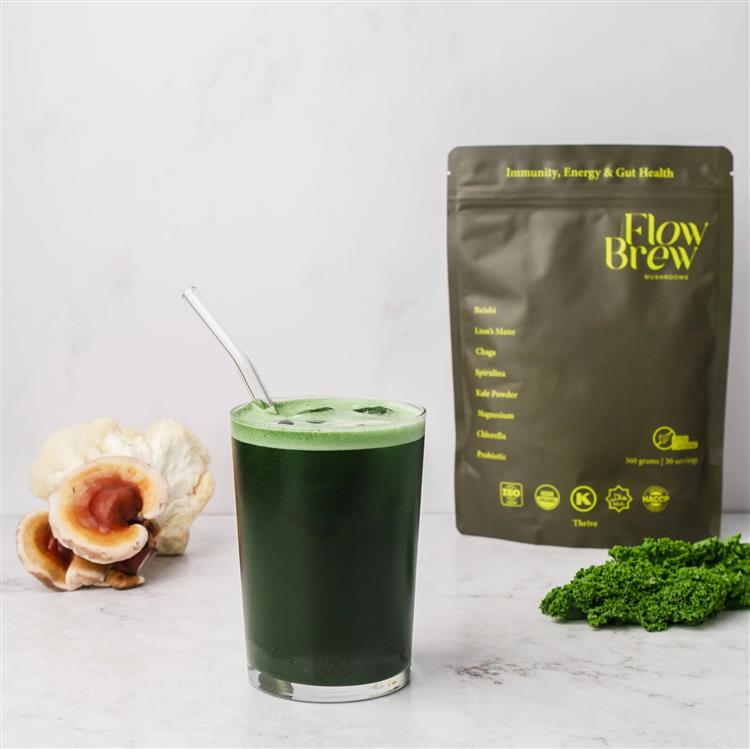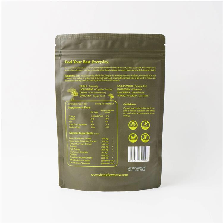 Packed with Reishi, Lion’s Mane, Chaga, Spirulina, Kale, Chlorella, Magnesium, and Probiotics, Thrive is a simple, natural way to boost your wellness every day. Whether you’re looking to stay sharp at work, recover after a workout, or give your immune system a natural boost, Thrive has you covered. With 30 servings per pack, it’s easy to integrate into your daily routine - just mix and enjoy Key Benefits: • Energy & Focus - Lion’s Mane, Cordyceps, and Reishi for cognitive clarity and lasting energy without the crash. • Immunity Support - Chaga and Reishi work together to strengthen your immune system. • Detox & Gut Health - Super greens like Kale and Chlorella help detoxify, while Probiotics support digestion and overall gut health. Discover Flow Brew Thrive Combining functional mushrooms and super greens, this blend is packed with eight of the world’s most potent, scientifically researched ingredients. Each mushroom and superfood in Thrive has been chosen for its unique ability to energise, protect, and detoxify your body, working together to support your daily wellness. Our Thrive Blend is made from organic, nutrient-rich mushrooms grown on eco-friendly substrates and combined with powerful super greens like Spirulina and Kale. These ingredients are full of essential nutrients, beta-glucans, and antioxidants, designed to help you feel your best. 3rd Party Tested Every batch of our Thrive Blend undergoes rigorous third-party testing to guarantee the highest levels of quality, purity, and potency, ensuring that you get the very best from every serving. Dual Extraction Using advanced dual-extraction techniques, we maximise the health benefits of our functional mushrooms, ensuring that each ingredient delivers its full range of bioactive compounds for optimal wellness. Powerful Ingredients Flow Brew Thrive is crafted with potent, hand-selected ingredients like Reishi, Lion’s Mane, Chlorella, and Kale - chosen for their ability to energise, protect, and detoxify your body, enhancing your overall well-being every day.