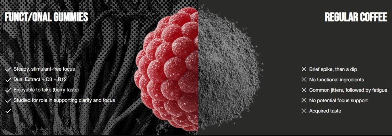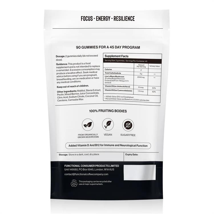 Energy Metabolism: Vitamin D3 and B12 contribute to the functioning of the immune and nervous systems as well as normal psychological function. Tastes Like a Treat: Juicy berry flavour with no mushroom taste, no pills, and no added sugar. Focus and Clarity Support: Dual extracted Lion's Mane reported by some people to support memory & focus. Energy: Vitamin B12 contributes to reduction in fatigue without caffeine, crashes, or over stimulation. Please Note: This product is not intended to diagnose, treat, cure or prevent any disease.