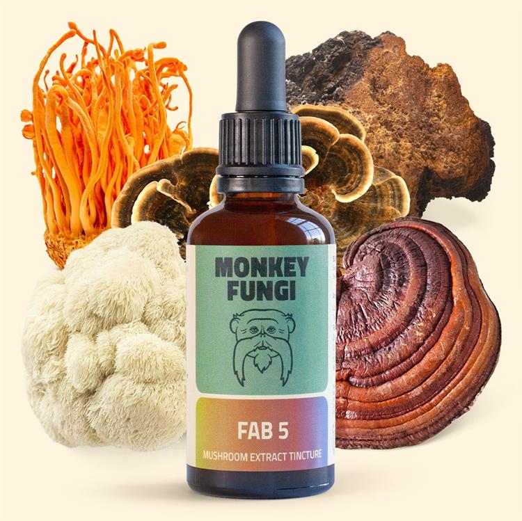 Our FAB 5 blend dual extract tincture is like a full-body boost in a bottle. Using both organic ethanol and hot water extraction, it captures the complete power of five of the most celebrated functional mushrooms.