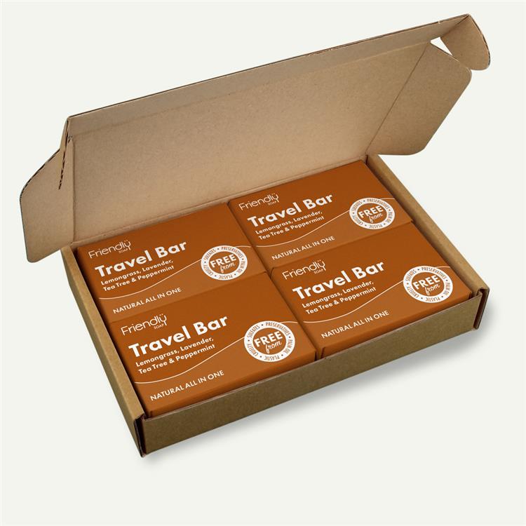 This natural travel soap isn't just a regular soap bar; it's a versatile cleansing and revitalising powerhouse. Use it as a natural soap bar, shampoo, or body wash, and discover its cleansing, deodorising, antiseptic, anti-fungal, and insect-repelling qualities. Plus, for those embracing the rugged spirit of bushcraft or backpacking, it even doubles as a trusty companion for hand-washing clothes. If you're taking this eco soap bar on your adventures, consider protecting it in one of our travel soap box. to keep it safe and dry. Handcrafted in the UK, each travel soap bar is carefully made from the finest plant-based ingredients. It includes a natural blend of coconut oil, castor oil, rapeseed oil, lavender, lemongrass, peppermint, and tea tree essential oils. This eco-friendly travel soap is a treat for your skin, hair and senses that will turn your bathing experience into a moment of pure relaxation and revitalisation. At Friendly Soap, we are passionate about sustainability; that's why all our natural soap bars are proudly made in the UK, using the purest plant-based ingredients. Our certifications from Cruelty-Free International and The Vegan Society reflect our strong belief that true beauty should never come at the expense of any harm. We're also proud to be 100% plastic-free, palm oil-free, and free from harmful chemicals like SLS and parabens, a testament to our dedication to your well-being and the well-being of our planet. 95g pH8-9 Ingredients: Sodium cocoate, Sodium rapeseedate, Aqua, Sodium castorate, Lavandula angustifolia (lavender) oil, Cymbopogon Citratus (lemongrass) leaf oil, Melaleuca alternifolia (tea tree) leaf oil, Mentha piperita (peppermint) oil, Aloe barbadensis (aloe vera) leaf juice powder, Citral*, Geraniol*, Limonene*, Linalool* *occurs naturally in essential oils.