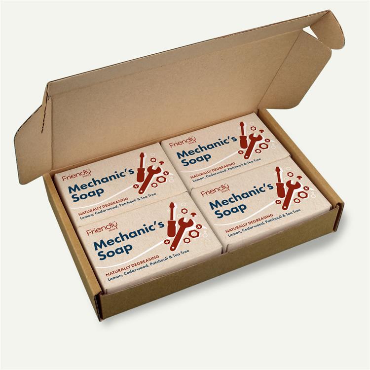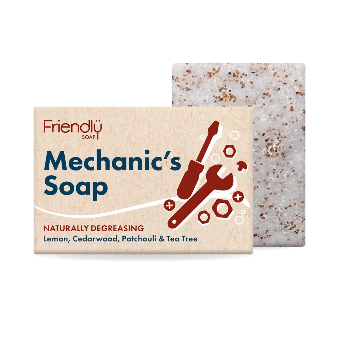 Friendly Soap’s Natural Mechanics Soap Bar is built for serious cleaning. Whether you're a mechanic, engineer, or weekend tinkerer, this bar is made to cut through tough grease, grime, and oil with ease. Lemon Essential Oil: Known for its powerful degreasing and deodorising properties, lemon helps break down oils and leaves behind a fresh citrus scent. Bicarbonate of Soda: A natural grease-cutter that lifts away stubborn dirt and oil, making this bar ideal for hands that work hard. Volcanic Pumice: Delivers gritty, effective exfoliation to scrub away grime and stains without being harsh on your skin. Patchouli Essential Oil: Acts as a natural antiseptic while providing a grounding, refreshing scent to finish off a deep clean. Handmade in the UK using high-quality plant-based ingredients. Certified by The Vegan Society and Cruelty-Free International. 95g pH8-9 Sodium cocoate, Aqua, Sodium castorate, Pumice, Olea europaea seed powder, Sodium bicarbonate, Cedrus deodara wood oil, Citrus limon peel oil, Pogostemon cablin leaf oil, Melaleuca alternifolia leaf oil, Limonene*, Citral* *occurs naturally in essential oils.