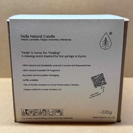 Calming, Relaxing, Meditative "Heila" is Norse for "Healing". A relaxing scent inspired by hot springs in Kyoto Herbal topnotes of palmarosa and rosemary combine with an uplifting core of ginger and lavender, softened with a warming base of amyris Housed in a matt grey recyclable glass vessel Now made from our new signature 100% natural and sustainable wax blend including British rapeseed oil and certified organic coconut oil. Soy and paraffin free as always 100% Natural Essential Oil Fragrance Made with sustainably wild harvested Haitian amyris Recycled and Recyclable Packaging 10% of Profits Donated to Forest Preservation Charities Hand made and hand poured in the UK with 100% renewable energy Refills available 220g *NB for a limited time you may receive a candle using our previous 100% natural coconut and rapeseed blend