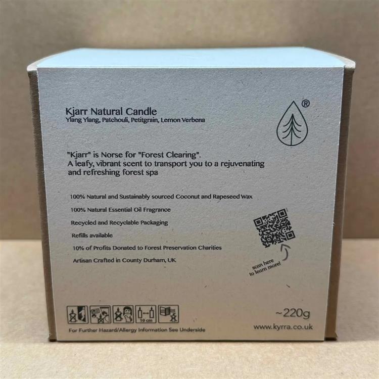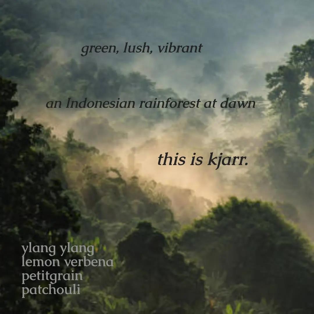 Green, Lush, Vibrant "Kjarr" is Norse for "Forest Clearing". Top notes of lemon verbena and petitgrain combine with warming and exotic ylang ylang and patchouli, creating a leafy and vibrant scent that transports you to an Indonesian rainforest
