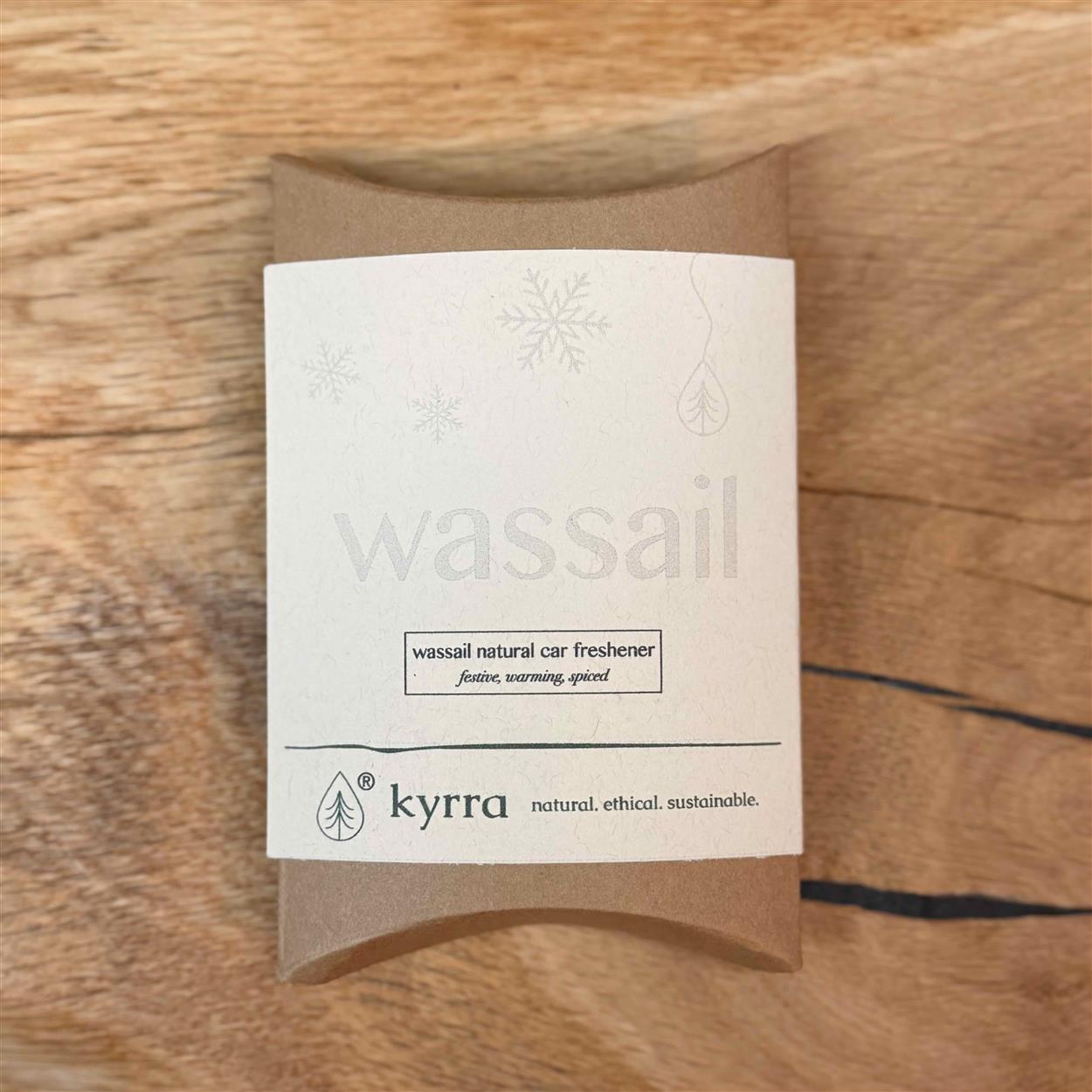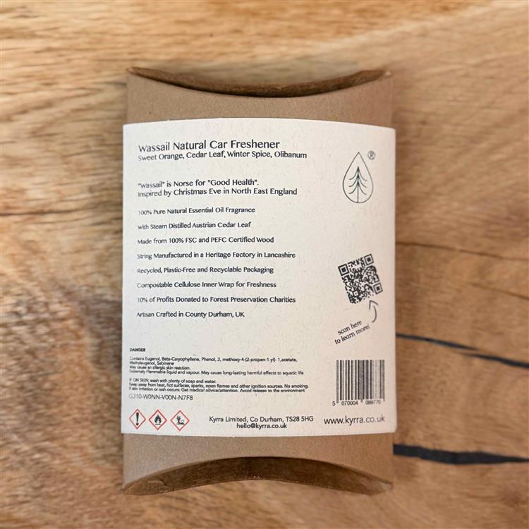 Festive, Warming, Spiced "Wassail" is Norse for "good health". Inspired by the festive drink that shares its name, a sophisticated warming scent inspired by Christmas Eve in North East England. Top notes of sweet orange and cedar leaf combine with a spicy core of ginger, nutmeg and clove, and warming base notes of cinnamon and olibanum Our new natural car fragrance tags are made with >99% naturally derived components from packaging to fragrance Fragranced only with 100% pure essential oils Made with certified organic and sustainably wild harvested Somali opoponax Hang tag made from triple certified (FSC, PEFC and Blaue Engel) engineered wood, laminated with a solvent-free plant-based glue Smart engineered design aids fragrance diffusion Infused using our own specially developed process for maximum fragrance and longevity String made from 100% cotton, manufactured in a Lancashire heritage mill Recyclable and recycled plastic-free UK-made packaging Sealed in a biodegradable cellulose inner bag Made in County Durham with 100% renewable energy Fragrance top-up bottles available soon