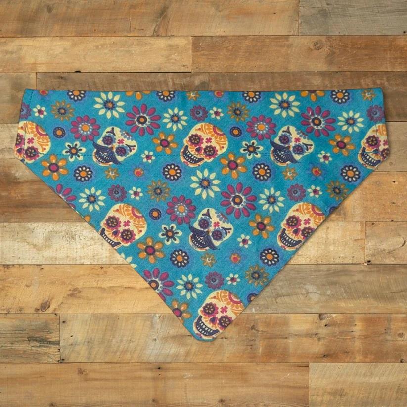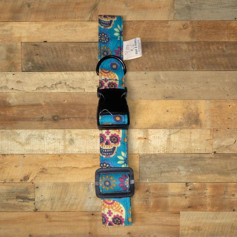 Celebrate colour, character, and creativity with our Day of the Dead Dog Collar, Lead & Bandana Set — a striking design inspired by the vibrant Día de los Muertos tradition. Featuring playful skulls and blooming flowers against a beautiful green-teal backdrop.