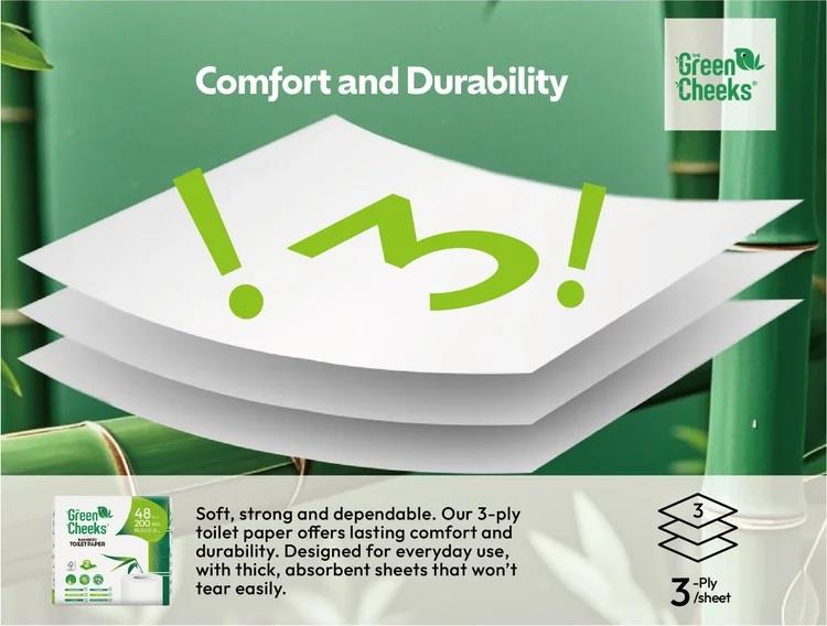 WHY BAMBOO? The Secret to Green Cheeks At The Green Cheeks, we believe in a bathroom routine that loves you back. Switching to bamboo isn't just a trend; it's a dual act of kindness for your skin and the planet. DUAL KINDNESS: Gentle on You, Tough on Waste We believe in Sustainable Comfort. Why settle for chemical-heavy wood pulp? PURE & NATURAL Our bamboo toilet paper contains no harsh chemicals, BPA, PFAS or artificial scents. Pure nature for your skin. HYPOALLERGENIC: Naturally hypoallergenic and antibacterial qualities make it the perfect choice for sensitive skin types. TRULY ECO-FRIENDLY: Unlike traditional options that clog landfills, our rolls are 100% biodegradable and compostable. THE ENVIRONMENTAL IMPACT CARBON FOOTPRINT HERO: Bamboo absorbs massive amounts of carbon dioxide as it grows. A BREATH OF FRESH AIR: Produces 35% more oxygen than trees, helping replenish what is lost to deforestation. CULTURAL WISDON: Utilizing a resource known for centuries to protect humans, animals, and ecosystems. ECO-CONSCIOUS PACKAGING RECYCLED BOXES: Shipped in 100% recycled cardboard materials. MINIMALIST DESIGN: We skip individual paper wrapping to save paper and reduce waste. ZERO-WASTE CORE: Don't throw it away! The core is a perfect biodegradable pot for starting garden seeds.