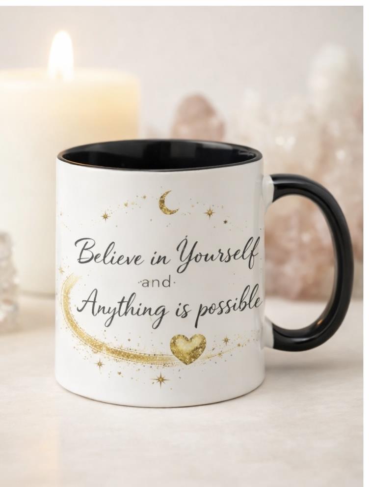 Believe in Yourself & Make a Wish” Affirmation Mug Start your day with a gentle reminder to believe in yourself and trust that anything is possible. This beautiful celestial-inspired mug features golden stars, a crescent moon and a flowing golden swirl surrounding the uplifting affirmation “Believe in Yourself and Anything is Possible.” On the reverse side, the simple phrase “Make a Wish” adds a little extra magic to every sip. Designed to bring a sense of positivity and inspiration to your daily routine, this mug is perfect for quiet morning moments, evening tea, or whenever you need a reminder to believe in your dreams. Positive Affirmation & Celestial Mug A magical design created to inspire confidence, hope and a little everyday wonder. Perfect for anyone who loves affirmations, spirituality, or starting the day with a positive mindset. A thoughtful gift for friends, family, or anyone who enjoys uplifting reminders and a touch of celestial magic. Inspiring affirmation design Elegant celestial theme with golden moon and stars Positive mindset & inspirational mug Perfect gift for friends, family, or self-care moments Ideal for daily use – coffee, tea, or hot chocolate ?? • 11oz ceramic mug • Design printed using high-quality sublimation printing • Hand Wash Preferred - Dishwasher safe for low temperature and top rack advised • Do not soak or use abrasive cleaning products Please note: Colours may vary slightly from the images shown due to screen settings and the sublimation printing process.