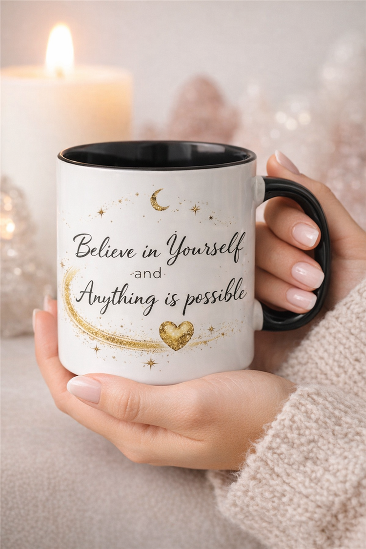 Believe in Yourself & Make a Wish” Affirmation Mug Start your day with a gentle reminder to believe in yourself and trust that anything is possible. This beautiful celestial-inspired mug features golden stars, a crescent moon and a flowing gol